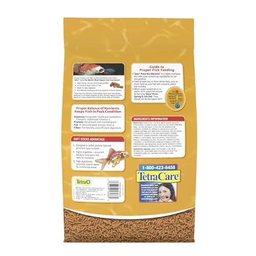 TetraPond Koi Vibrance pond fish food is a highly nutritional diet for all sizes of koi and ornamental goldfish. This formula brings out the vibrant reds and yellows of these pet pond fish. Supplies nutrition for energy, longevity and overall health – feed in spring, summer and fall when water temperatures are 50 degrees and above. This formula contains vitamins for growth, health and metabolism; amino acids for growth and maintenance; fats for a concentrated energy source; and fiber for healthy and efficient digestion. TetraPond Koi Vibrance food is designed to soften quickly for toothless pond fish. It’s highly digestible to help promote clear water and minimize waste. Feed at least two to three times daily, only as much food as your fish will consume within five minutes. When water temperature is below 50 degrees, pond fish feed with TetraPond Spring & Fall Diet. Fish should not be fed when the temperature is below 39 degrees. Since 1951, Tetra has developed the world’s most comprehensive body of fish food knowledge, and fishkeeping enthusiasts have looked to the brand for products and solutions that add ease and beauty to their home. Whether you’re an experienced hobbyist or just starting out, Tetra has everything you need – from a large variety of quality fish food and innovative equipment to test kits and decor.