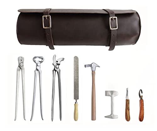 Well assorted farrier kit includes leather bag for easy transport, and the following tools. (1) Nail Puller, (1) Nipper, (1) Clincher, (1) Rasp, (1) Hammer, (1) Buffer, (1) Hoof Cleaner, (1) Oval Hoof Cleaner